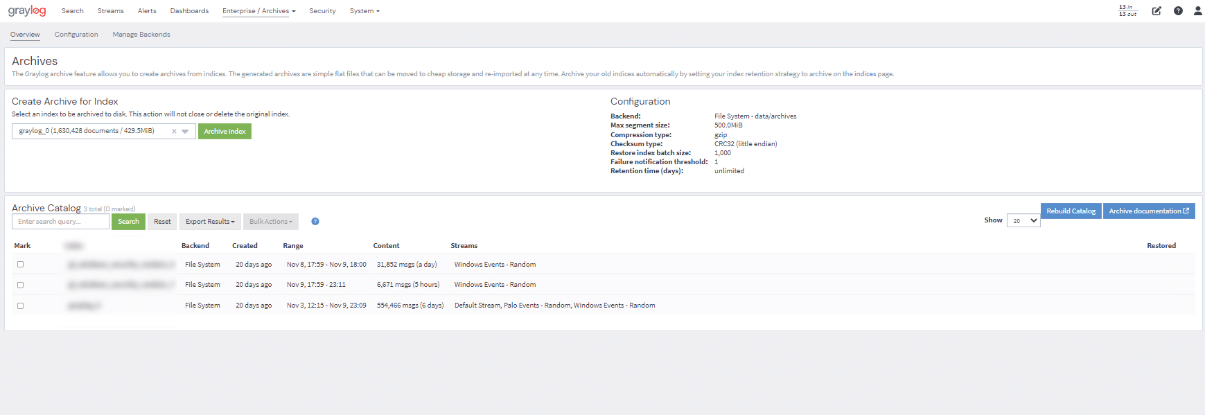 If you need to take another look at archived data, you can temporarily re-import any archives for analysis in Graylog using the web interface. After you finish, you can once again delete the imported archive data.