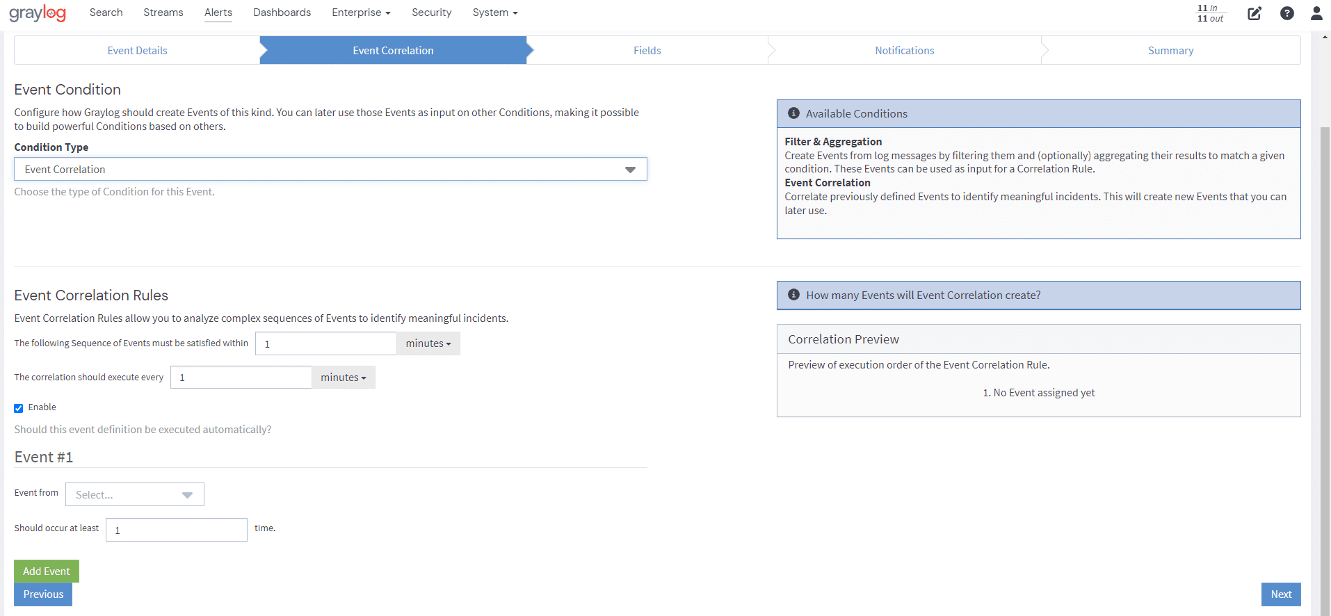 Graylog is monitoring all the logs as they enter the system, and based on defined event and alert rules, will take the logs of interest and move them from the noise into their own Elasticsearch index. With the high value logs in their own index, you can run queries on those events to see if there is a pattern of activity, or lack of activity.