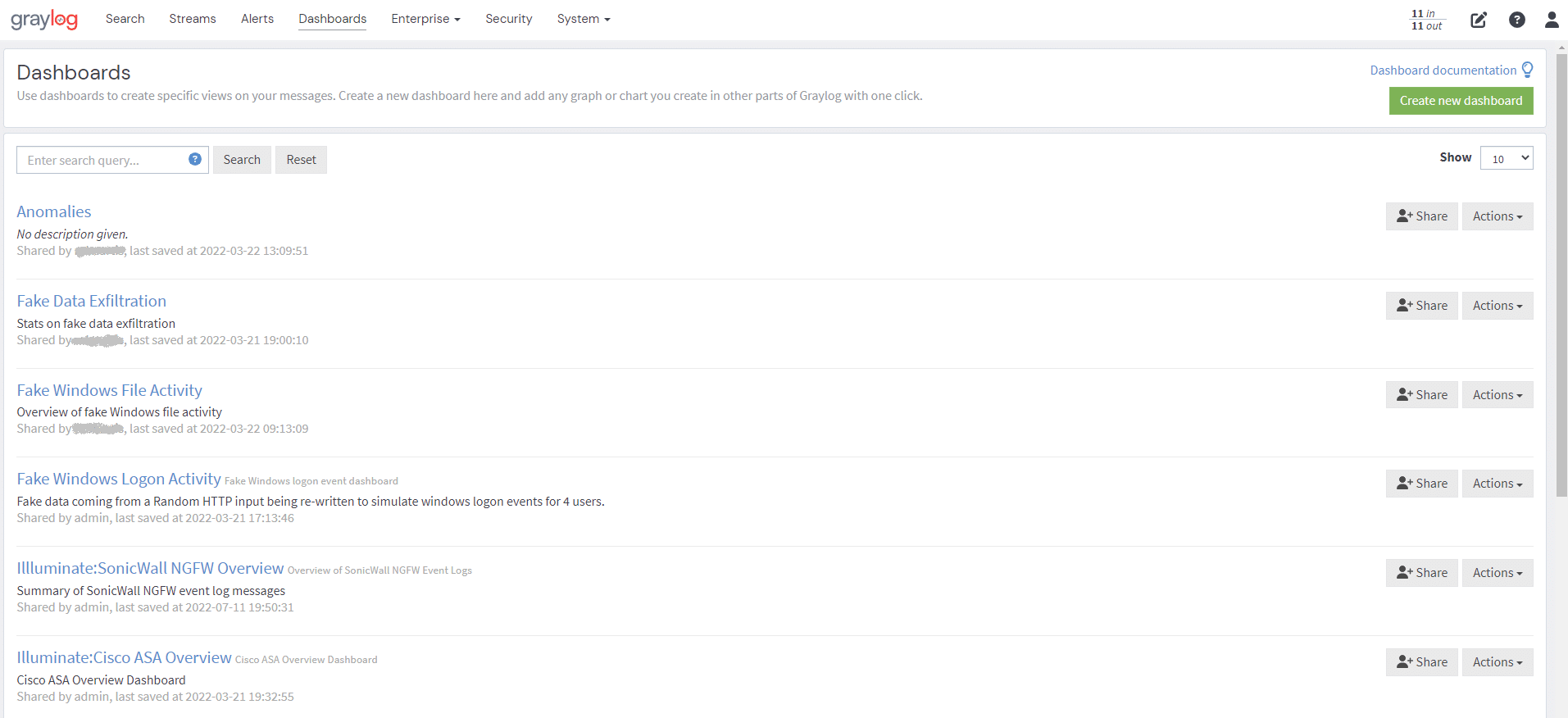 Graylog supports a wide variety of widgets that let you quickly visualize data from your logs. Adding search result information is easy and quick. Once you add widgets to the dashboard, you can rearrange and configure those widgets to customize the look.