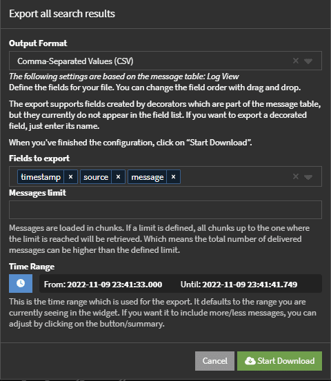 You can create a Log View Widget in Graylog so that you can easily export data to dashboards and reports. Once you have created your Log View Widget and you have all the fields and view set to what you like, saving this as a Dashboard will enable you to export the raw data in Plain Text format, JSON, NDJSON or CSV delimited format. You can also schedule your Log View information in Reports and have it emailed to you.