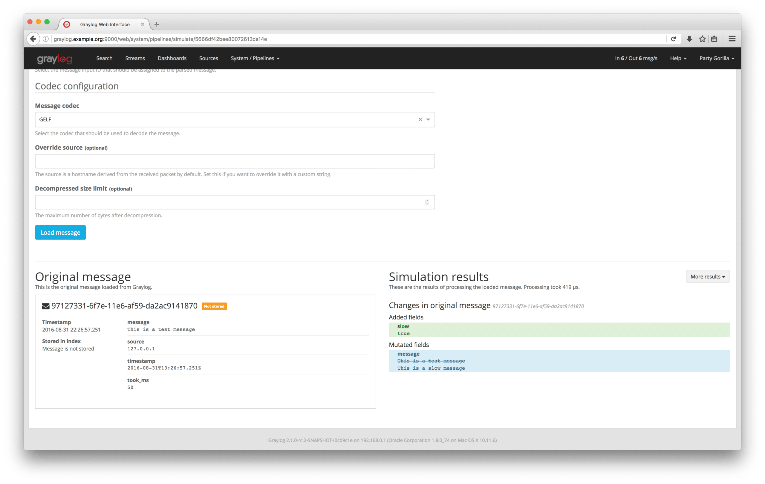 The Graylog Processing Pipeline now comes with a complete simulator user interface that allows you to test your pipeline and rule compositions.