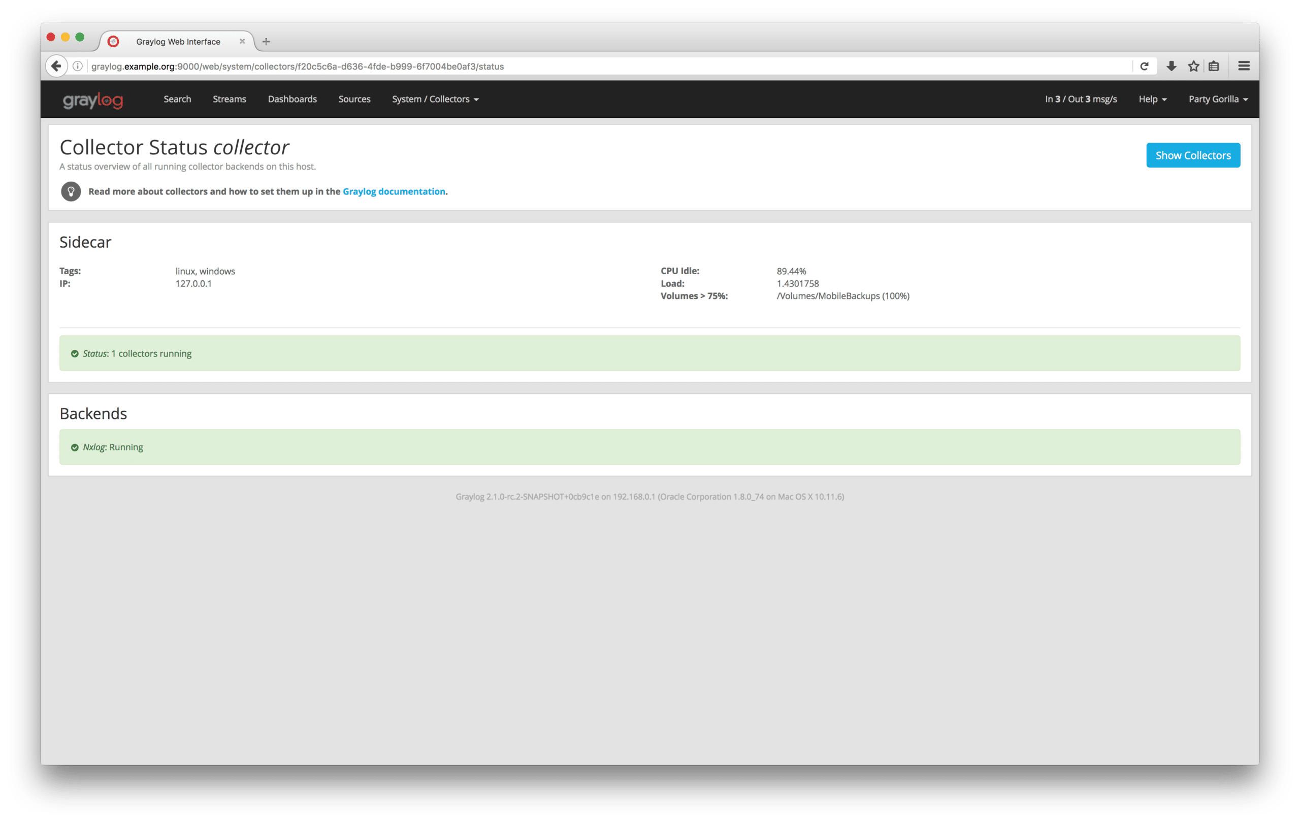 Collectors can now send their internal status back to Graylog. A status page lists all running collectors for each host. In case of an error, the host is marked with a small red badge to indicate the problem and with a message to get an idea of why the collector is failing. In addition, the user can find general information on the status page like the tags that are configured for the Sidecar or a list of available log files. A real headless administration is now possible with these changes.