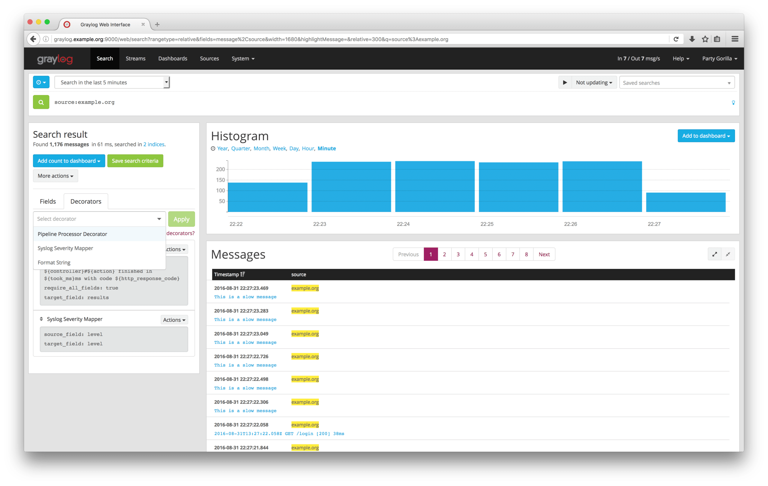 Message decorators allows you to modify message values on search result pages automatically. A classic example would be to change the numerical severity level of a syslog message (level=4) to a human readable string like level=warning (4).