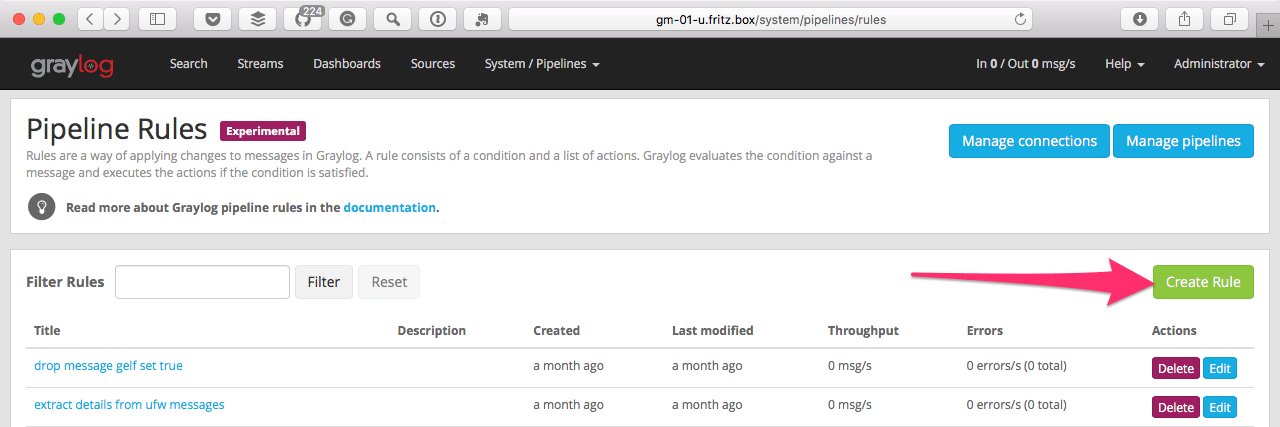 Everything starts with a rule. To create a Pipeline rule, Navigate to ‘System > Pipelines’ and select ‘Manage Rules’. This is where you create a new rule.