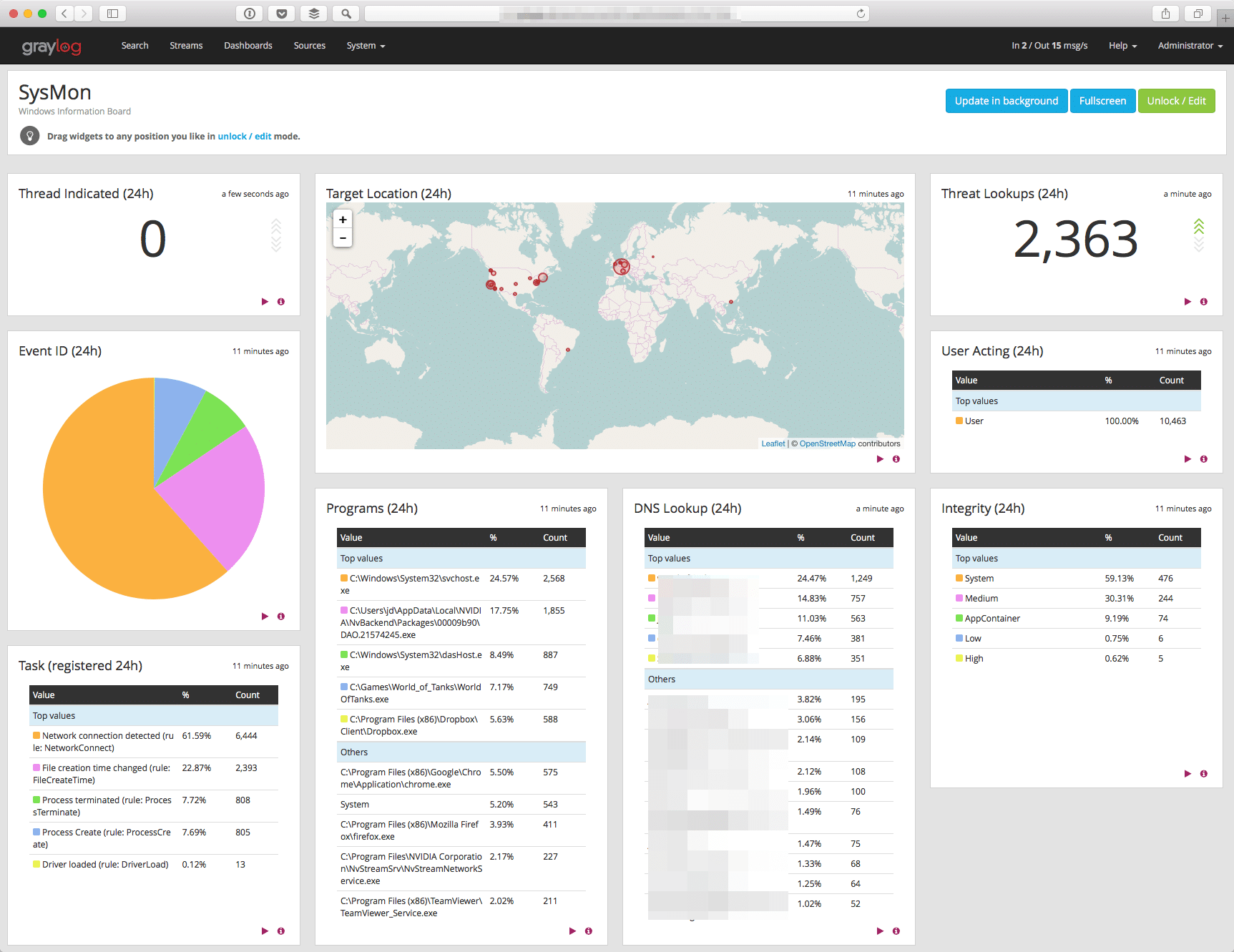 The Microsoft System Monitor (sysmon) that provides you information about your Windows also writes messages to the Windows Event Log. After installation and configuration, you can configure your already running winlogbeat to get the sysmon messages into Graylog. For added protection, you can also install our threat intelligence plugin. The plugin adds processing pipeline functions to enrich log messages with threat intelligence data. Note, the threat intelligence plugin is still in testing mode.