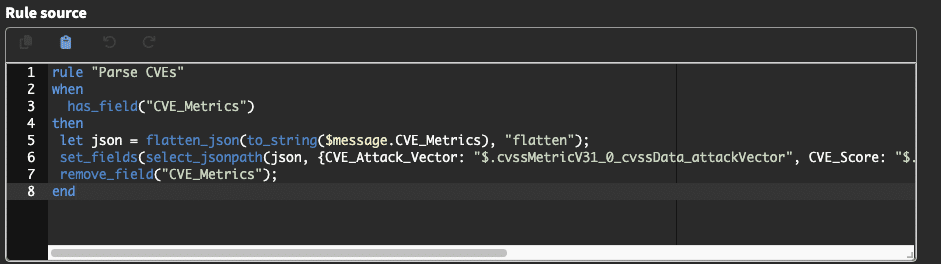 I won’t go through each pipeline rule, as it’s included in the pipeline, but for example, if I just want to make the JSON object easier to work with and set some fields, I can do something like the below where we flatten the JSON and then set the fields, and remove the original object.