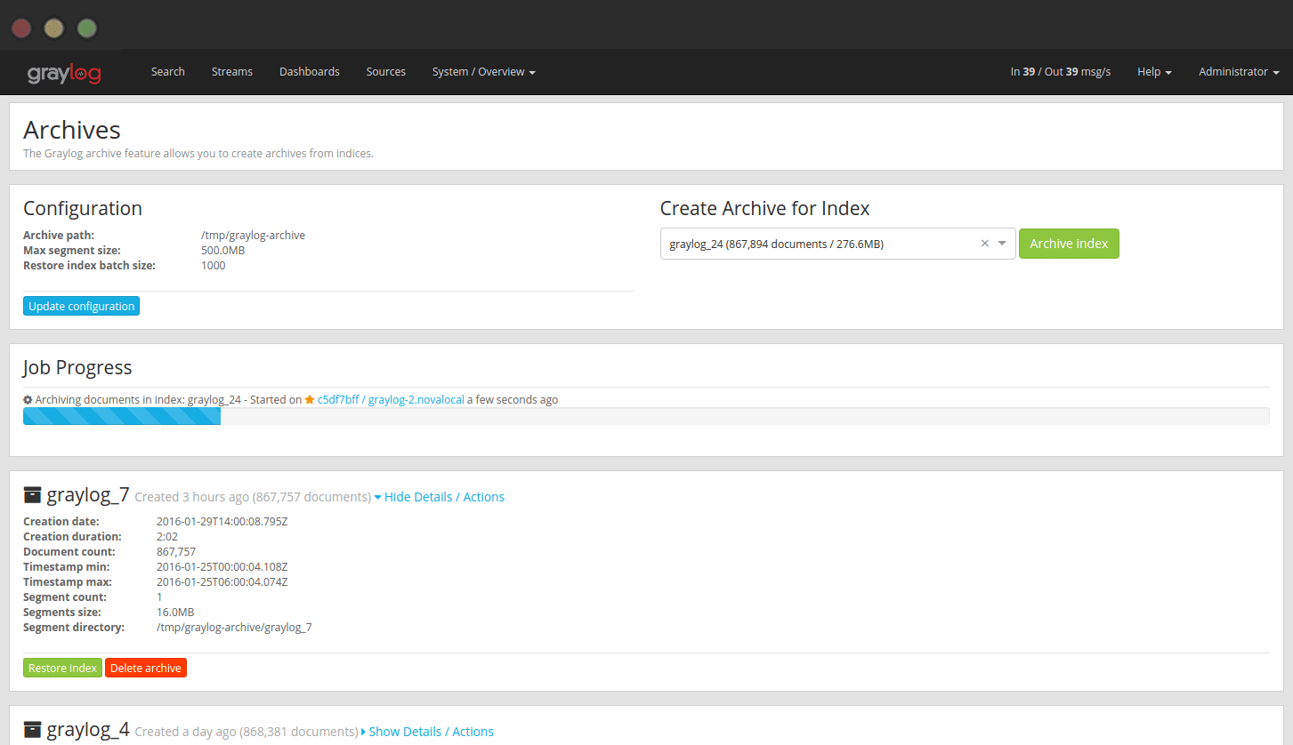 The web interface also makes it very simple to move any or all these archived messages back into the original Graylog folder so you can temporarily import and analyze them. In other words, they’re still available if you need them for working purposes. Since flat files are vendor agnostic, data can be easily and freely accessed at any time. Even better, you now have all the liberty to make whatever you want with these archived files. You can print them on paper (think about compliance documents), move them to cheaper storage systems, or even write them on tape.