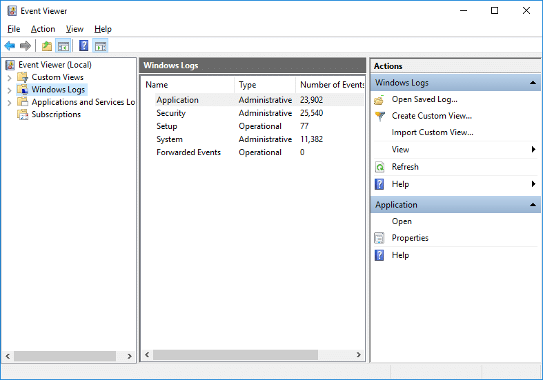 Event Viewer is utility software that helps Windows administrators troubleshoot various issues. Each event has its unique ID, which makes it easier to discover solutions for some problems by googling the event ID and reading about other people’s ways of dealing with them. Windows logs are divided into application, security, setup, system, and forwarded events folders for easier access.