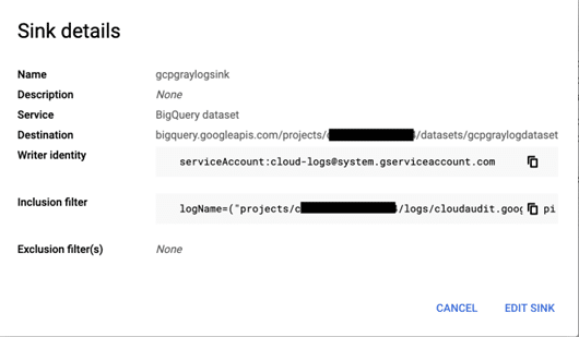 You will notice that the writer identity is not that of the service account we created earlier. This is not editable. Copy the service account name which in this case would be: “[email protected]” the “serviceAccount:” part is just a prefix. You can also view the inclusion filters from here now if you would like.