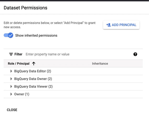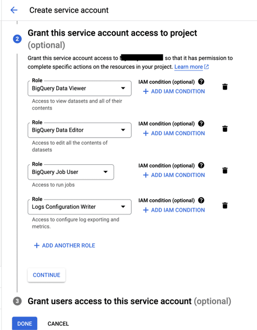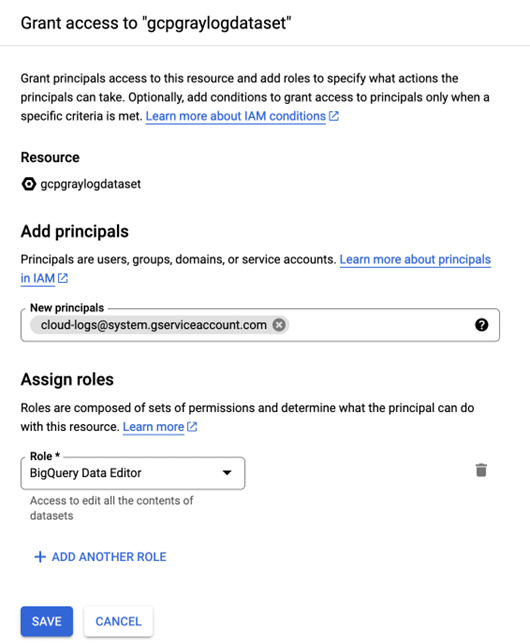 Paste the writer identity into the principal and assign the BigQuery Data Editor role, save the change.