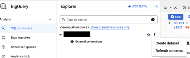 So essentially if you want to deploy this in another region you can simply go to the BigQuery SQL editor and under your project, select Create dataset.