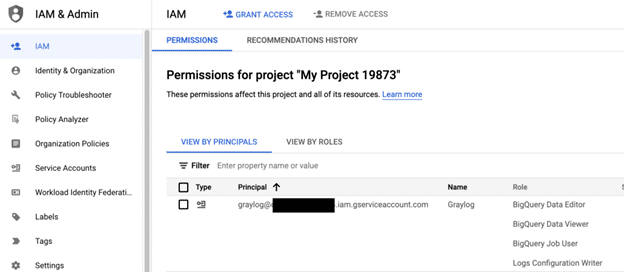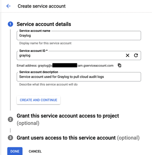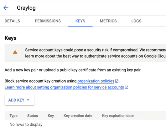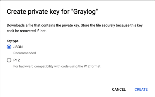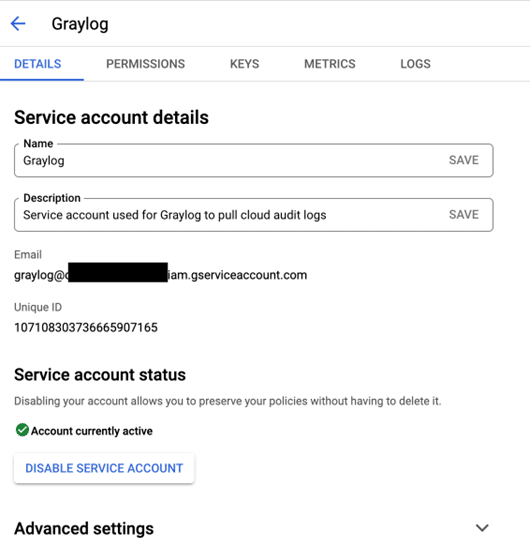 We need to generate a key file for Graylog, go back to the service accounts section and click on the new service account which will take you to the account details panel, now is a good time to write down the unique ID of the account as you will need this for the input creation in Graylog.
