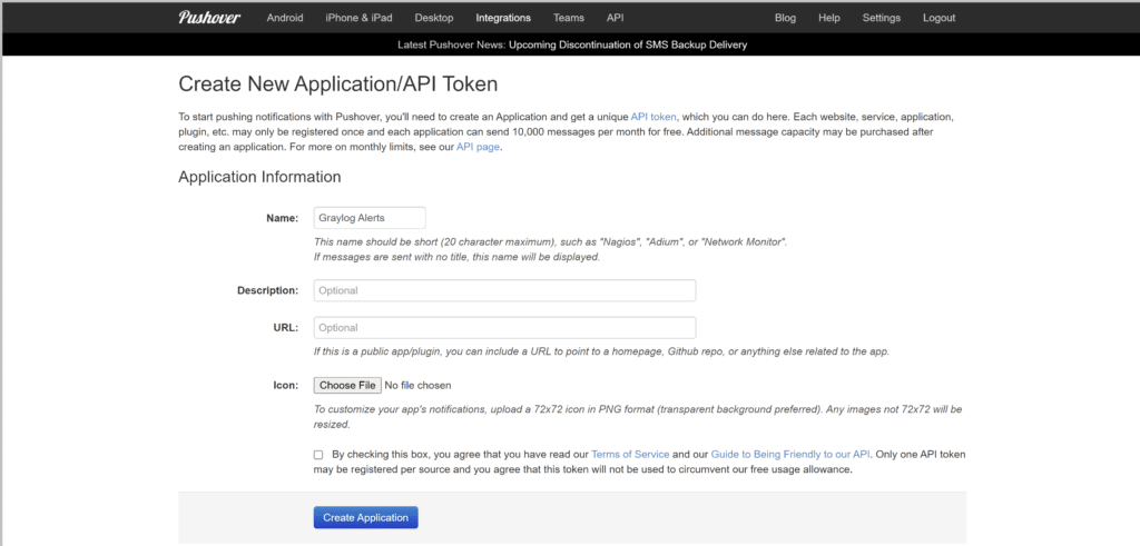 Log in to the Pushover dashboard and create a new application to generate your API token. This token will be used to authenticate your notifications.