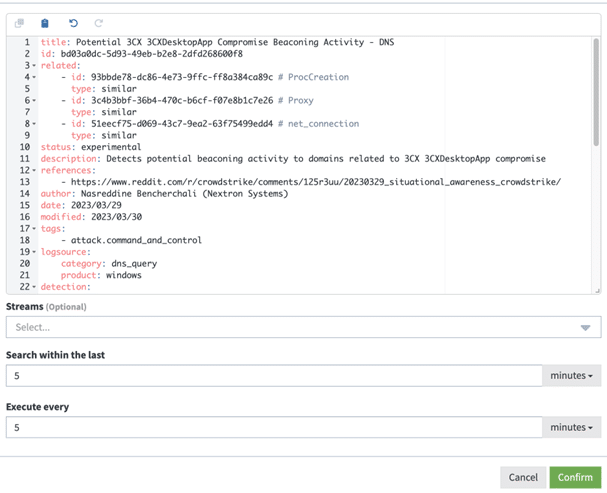 Many Sigma rules are directly mapped to ATT&CK tactics and techniques. For example, in a Sigma rule to look for indicators of compromise (IoCs) from a supply chain attack exploiting a vulnerability in the 3CX Desktop Application the tag indicates the ATT&CK tactic: