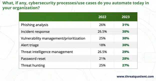Automation removes tedious repetitive tasks and eliminates opportunities for mistakes. A recent 2023 survey, indicated 75% of security leaders say cybersecurity automation is important, up from 68% in 2022. Teams are tackling automation in a variety of areas. The biggest rise was for alert triage to 30% compared to 18% in 2022. For vulnerability management, there was a 5% rise to 30%. Another common use case for automation in 2023 was phishing, adopted by 31% of respondents.