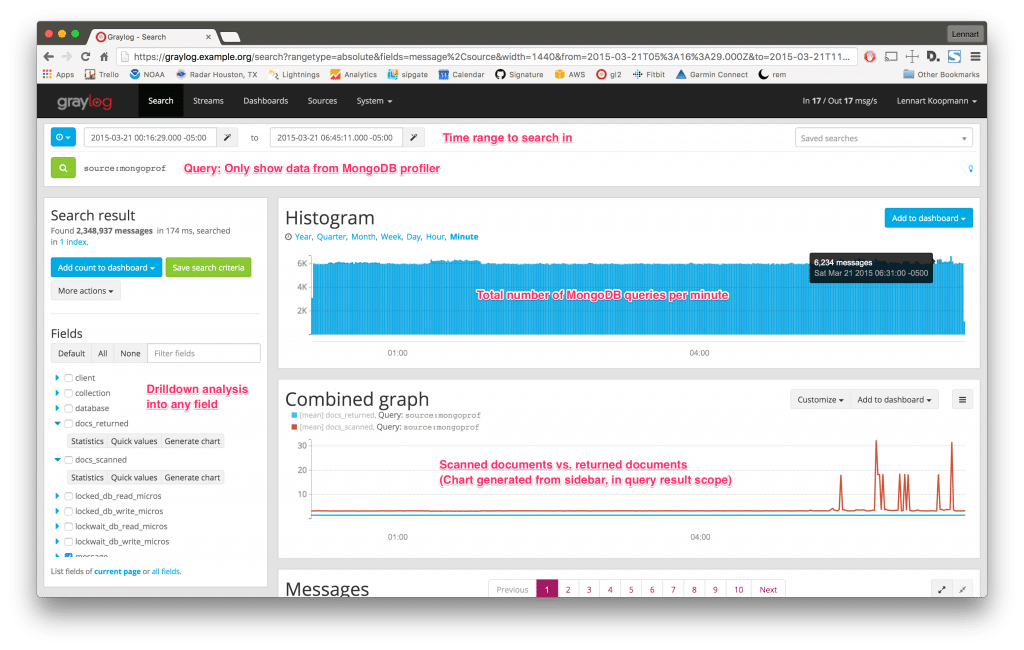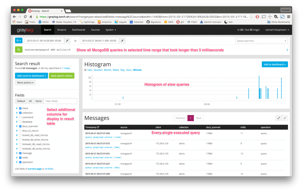 Let’s start by running a Graylog query that shows you all recorded MongoDB queries in a specific time frame: