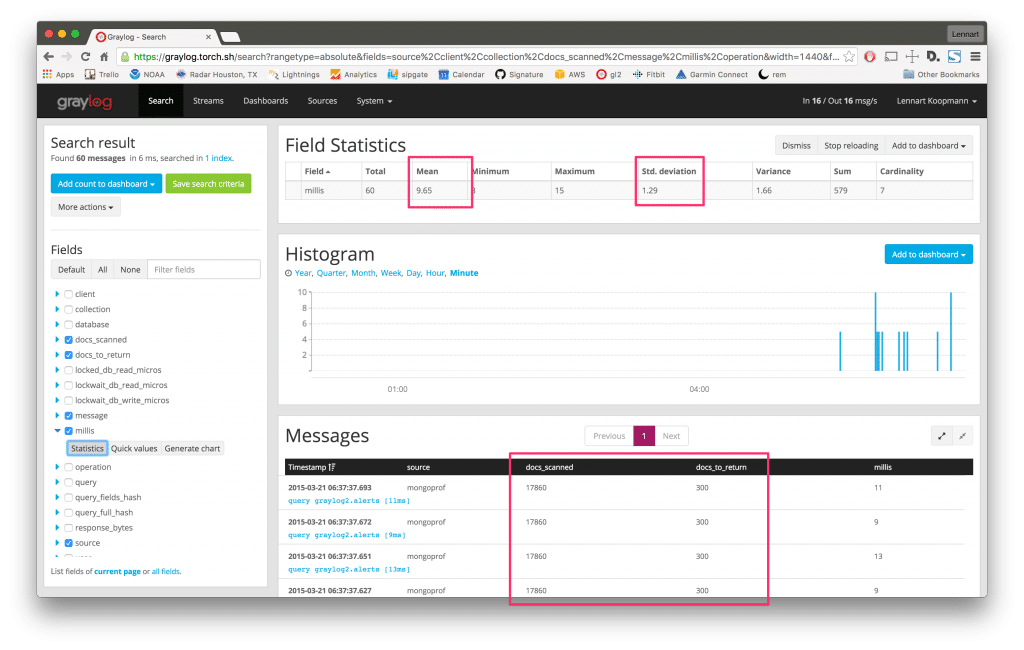 Now all search results and analysis methods are only applying to a single type of query. By analyzing the field millis we can see that the mean calculation time is 9.65ms and the stddev is not very high, indicating that this query is indeed always slow. The search result table is indicating the same. The histogram shows you when exactly this type of query has been executed.