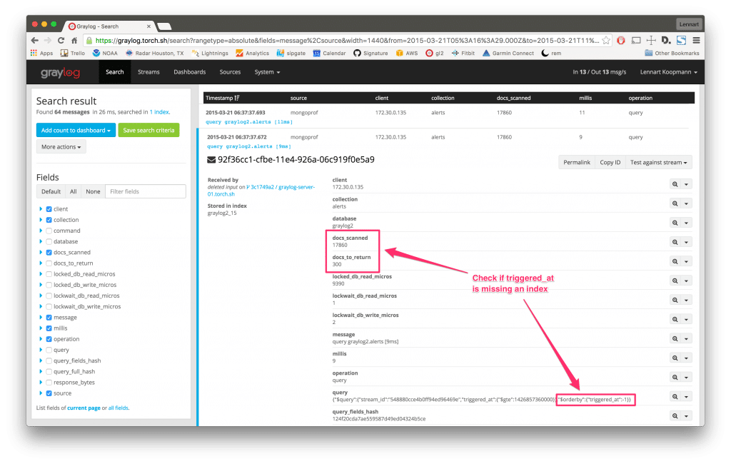 The Fields sidebar was used to select what detailed information to show in the Messages table. You could even sort the table itself on the field millis to show the slowest queries on top. Looking at the Messages table, we see that the slow queries against the alerts collection generally take around 9 to 13 milliseconds and scan 17,860 documents. It seems unusual to request so many documents from the alerts collection at once.