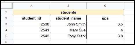 This is an example of a Google spreadsheet where each column represents a different type of information (student ID, student name, and GPA) and each row represents one student and information related to them.