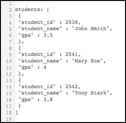 This is an example of a .json file containing information on three different students in an array called students. Data is represented in name-value pairs separated by commas, and curly braces indicate different objects (in this case, students) within the array.