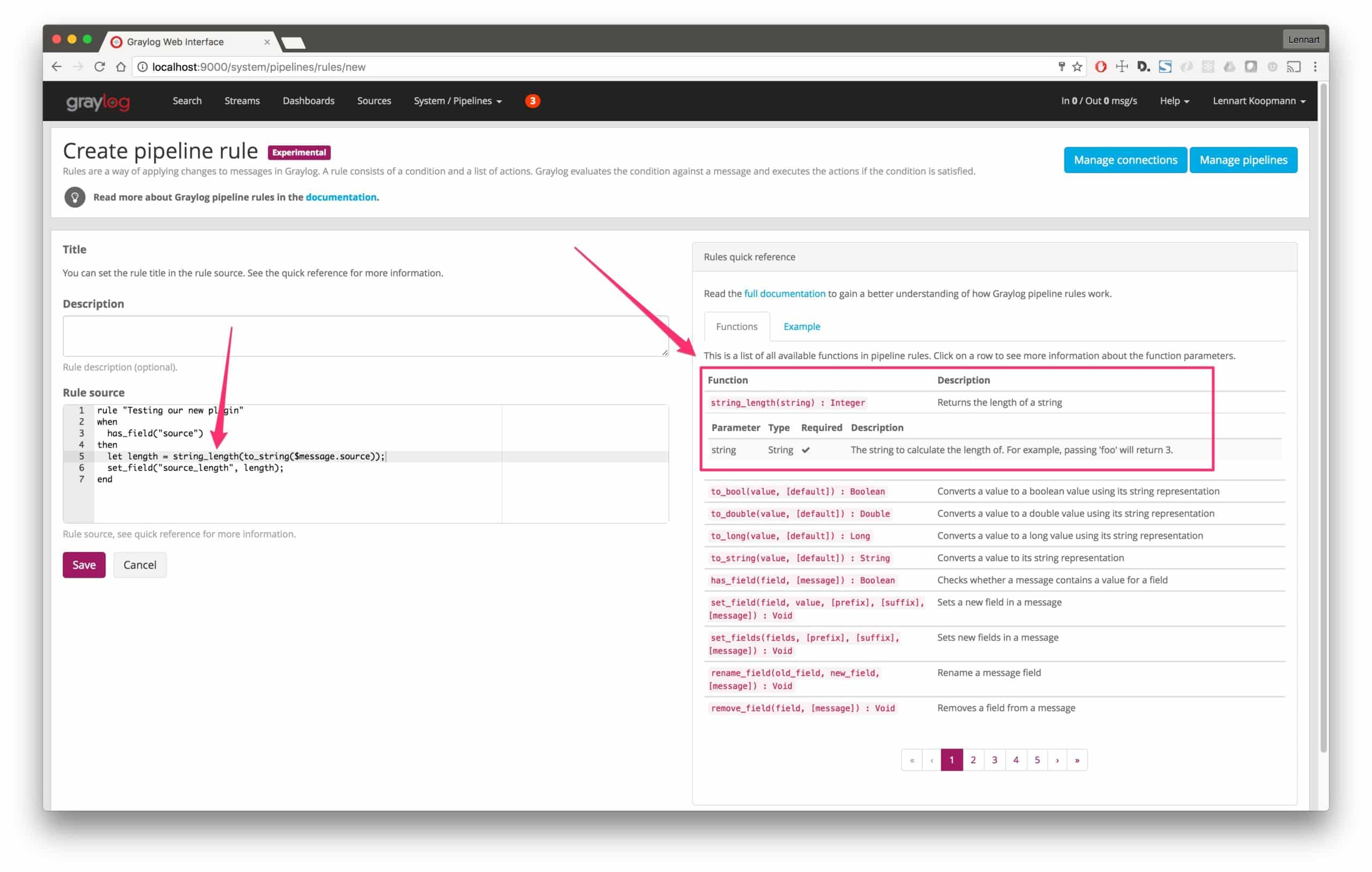 Now that we have gone through the full process of creating a function with a single call to String#length(), you will be able to write more complex functions. A more sophisticated example is the Graylog Threat Intelligence Plugin that deals with calls to other web services, dynamic configuration from the web interface, and caching.