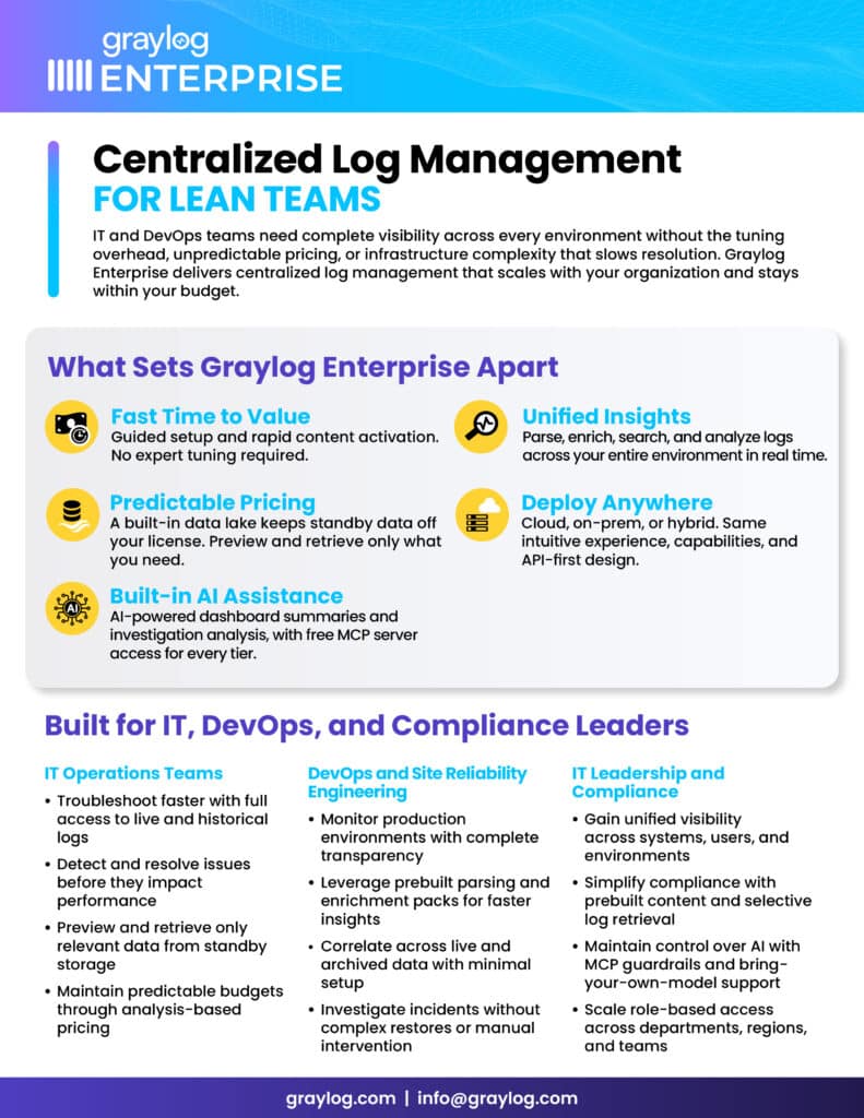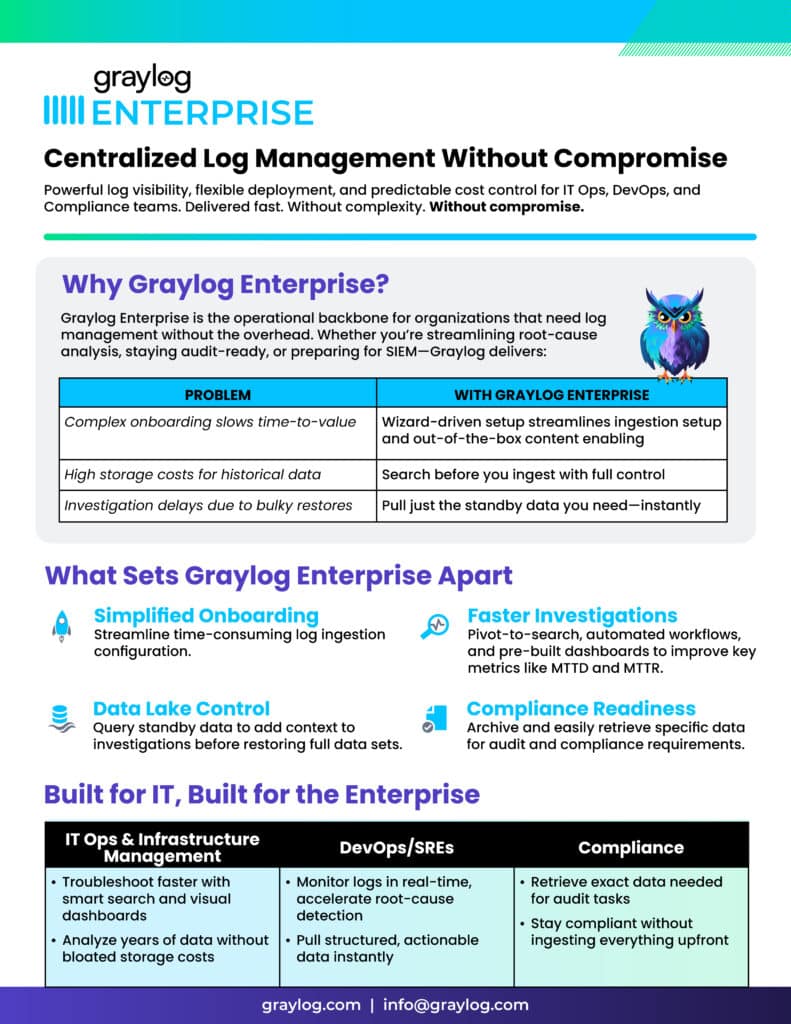 Your infrastructure, devices, and applications are generating volumes of log data that can give you insight into the health of your environment. All log data, including syslog, Windows®, or VMware® events, are crucial components of the complete picture of your environment, and can help with troubleshooting and threat detection. Graylog Enterprise can collect, normalize, and analyze log data so you can detect and find the root cause of security and performance issues faster.