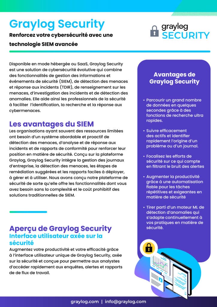 Disponible en mode hébergée ou SaaS, Graylog Security est une solution de cybersécurité évolutive qui combine des fonctionnalités de gestion des informations et événements de sécurité (SIEM), de détection des menaces et réponse aux incidents (TDIR), de renseignement sur les menaces, d’investigation des incidents et de détection des anomalies. Elle aide ainsi les professionnels de la sécurité à faciliter l’identi