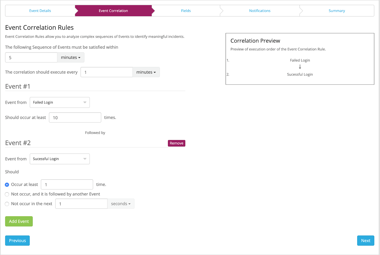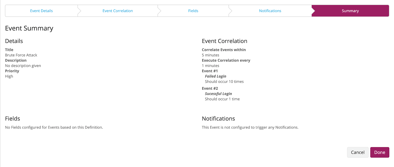 In an information security context, events could describe successful and failed logins across a variety of platforms and correlation rules can alert you when a large number of failed logins are followed by a successful login for the same user, indicating a possible brute force attempt.