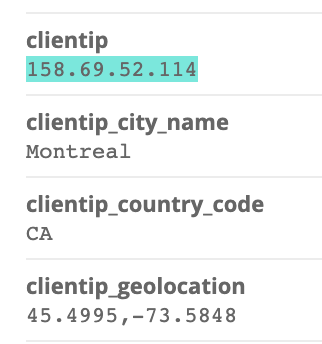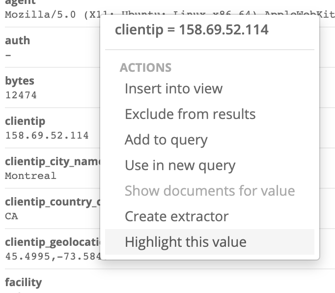 Here you can see highlighting the `clientip` field and how it looks after highlighting has been performed. This allows for the rest of the logs on the page to have the same color for quick identification.