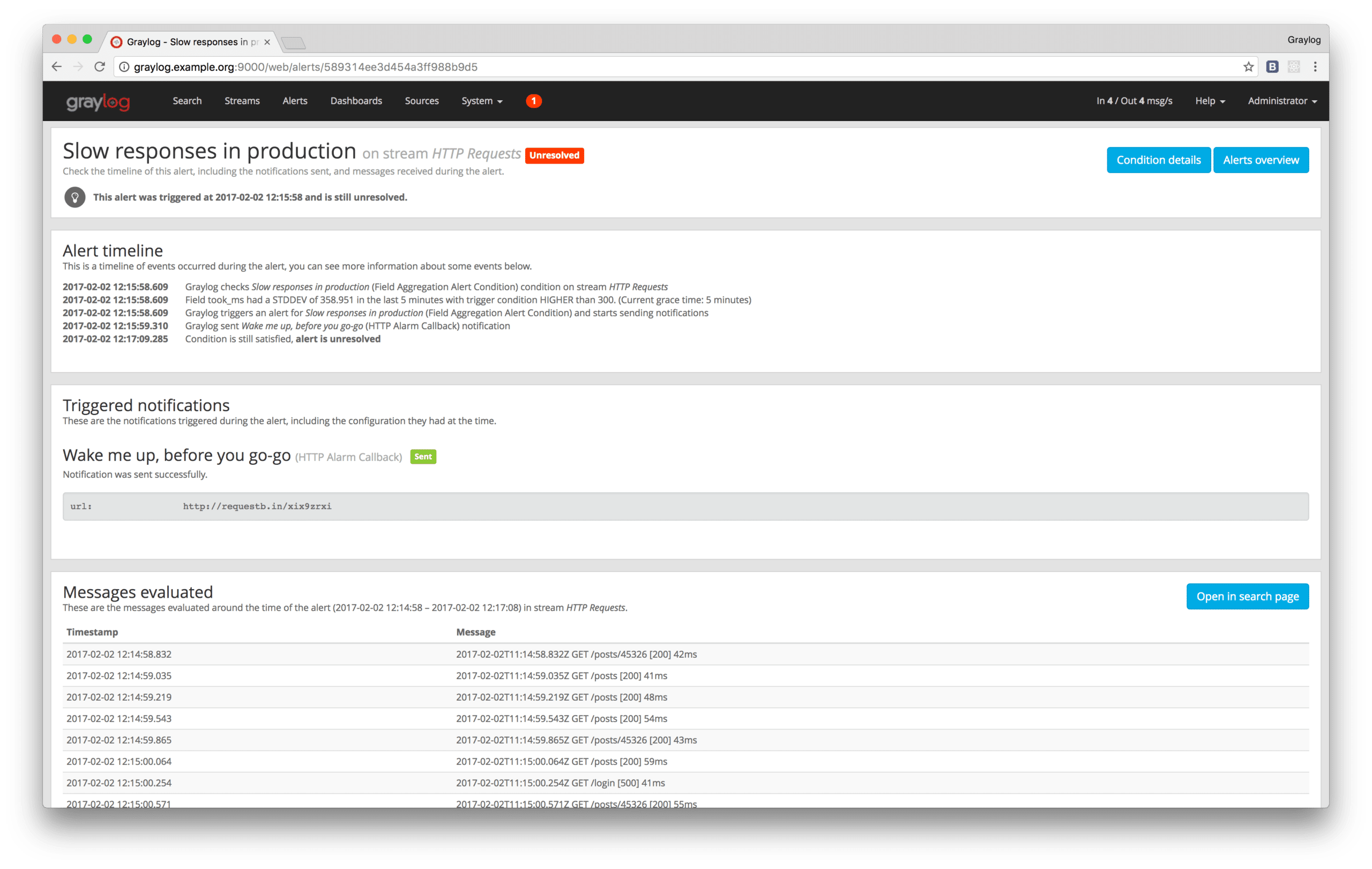 We’ve made it easier to manage your alert notifications by adding an Alerts page in the navigation bar. The alerts overview page lets you view which alerts currently require your attention in an easy way. You can also easily check alerts that were triggered in the past and are now resolved. From within the alert details page, you can see a timeline of what occurred since Graylog detected an alert condition was satisfied. This includes the time when Graylog evaluated the condition that triggered the alert, the time when notifications were executed and the results of executing them, and the time when the alert was resolved (if that is the case).